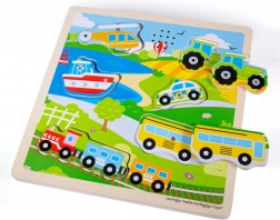 Układanka zawiera różne środki transportu, dzięki czemu dzieci lepiej poznają otaczający je świat.