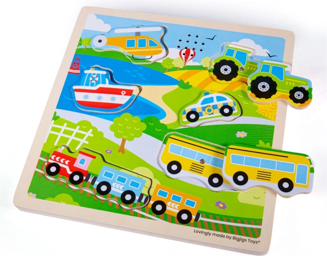Zabawna drewniana układanka dla dzieci z motywem pojazdów, która po umieszczeniu elementu we właściwym miejscu odtwarza dźwięk charakterystyczny dla danego pojazdu, rozwijając dziecięce umiejętności poznawcze.