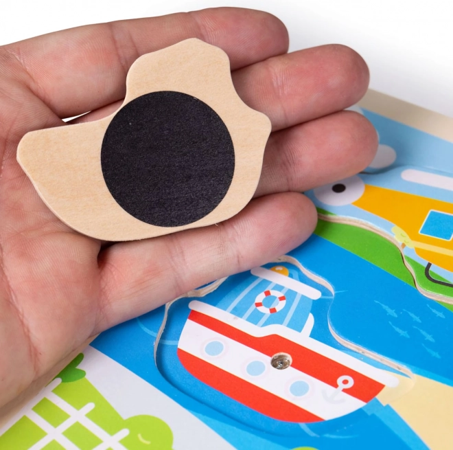 Dzięki tej drewnianej układance dzieci mogą w zabawny sposób rozpoznawać różne kształty i pojazdy, a także cieszyć się dźwiękami, które wydają poszczególne elementy. Ten interaktywny element pomaga rozwijać zdolności motoryczne i percepcję przestrzenną.
