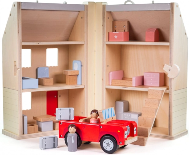 • Kompletny zestaw: 3 piętra, 13 elementów mebli, 2 figurki i drewniany samochodzik