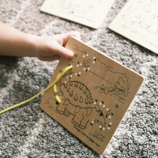 Wspieraj w zabawny sposób rozwój podstawowych umiejętności matematycznych oraz motoryki małej u dzieci. Podążając za liczbami i stopniowo przewlekając sznurówki, mogą odkrywać zarysy różnorodnych obrazków. W zestawie znajduje się stojak, w który można wstawić tabliczkę z gotowym dziełem i ozdobić nią stolik lub półkę. Do wyboru jest kilka różnych motywów. Wykonano z wysokiej jakości, odpowiedzialnie pozyskanych materiałów. Główne właściwości: 3 tabliczki z różnymi obrazkami, 3 kolorowe sznurówki oraz stojak, solidne i trwałe wykonanie