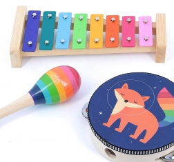 Zestaw obejmuje ksylofon, tamburyn, trójkąt i marakasy, dzięki czemu stanowi doskonałe narzędzie edukacyjne do rozwoju umiejętności muzycznych i poczucia rytmu u dzieci.
