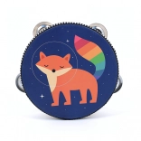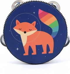Tamburyn zdobiony uroczą ilustracją lisa z tęczowym ogonem na niebieskim tle, co oferuje dzieciom radosny sposób tworzenia muzyki.