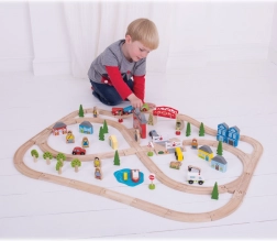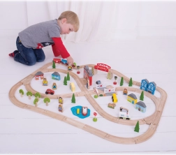 Tory i akcesoria BIGJIGS RAIL łatwo połączysz z większością drewnianych kolejek dostępnych na rynku – rozbudowuj swoje miasto i wieś bez ograniczeń.