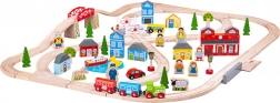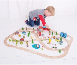 Kompleksowa sceneria miejska i wiejska z mostem, przejazdem, budynkami, drzewami i figurkami zapewni dzieciom bogatą inspirację do zabawy i rozwoju wyobraźni.
