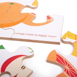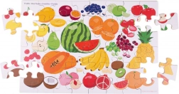 Puzzle zawiera kolorowe ilustracje, które pomagają dzieciom wizualnie identyfikować różne rodzaje owoców, takie jak arbuz, pomarańcza czy banany.