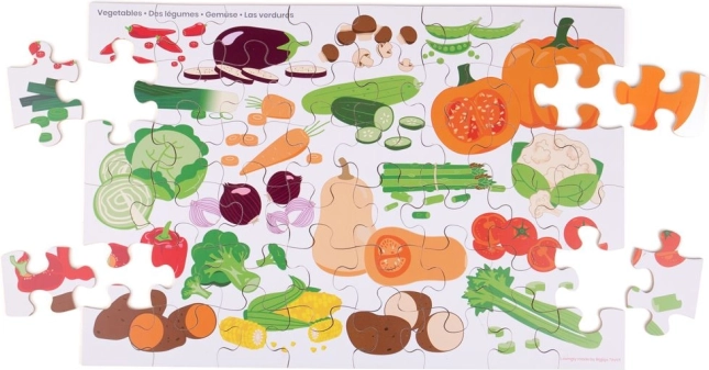 Układanka obejmuje różne rodzaje warzyw, takie jak dynie, papryki i marchewki, edukując dzieci o żywieniu i zdrowym stylu życia.