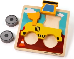Układanka wkładana dla najmłodszych z motywem koparki, wykonana z wysokiej jakości, odpowiedzialnie pozyskiwanych materiałów. Świetne narzędzie do rozwoju motoryki małej, logicznego myślenia oraz rozpoznawania kształtów i kolorów.