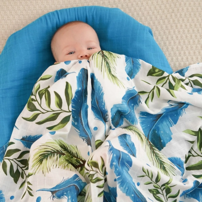 Piękny motyw z niebieskimi piórkami i zielonymi liśćmi doda stylu każdemu miejscu, gdzie wykorzystasz kocyk.