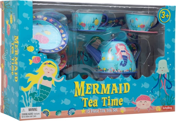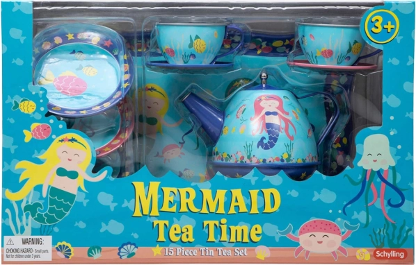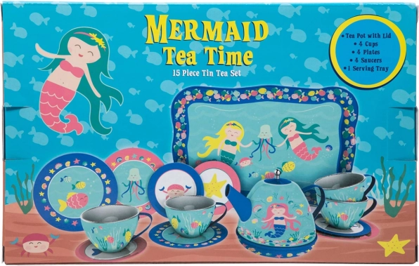 Kiedy nadchodzi pora herbaty, nie ma lepszego wyboru niż ten wspaniały metalowy zestaw. Kreatywność rośnie, gdy dzieci podejmują gości, lalki i pluszaki tym pięknym serwisem. Zestaw zawiera 4 filiżanki ze spodkami, 4 talerzyki deserowe, dzbanek do herbaty z pokrywką oraz tacę do serwowania — wszystko w stylistyce syren.