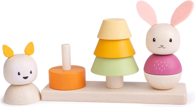 Ta wysokiej jakości drewniana zabawka do układania BIGJIGS BABY oferuje dzieciom od 12 miesięcy mnóstwo zabawy i nauki. Trzy oddzielne pręty z elastycznym łączeniem umożliwiają łatwe i bezpieczne nakładanie elementów: na bocznych prętach buduje się liska i króliczka, na środkowym stylizowaną sosnę. Pastelowe odcienie i przyjemne kształty zachęcają do odkrywania, sortowania i budowania.
