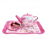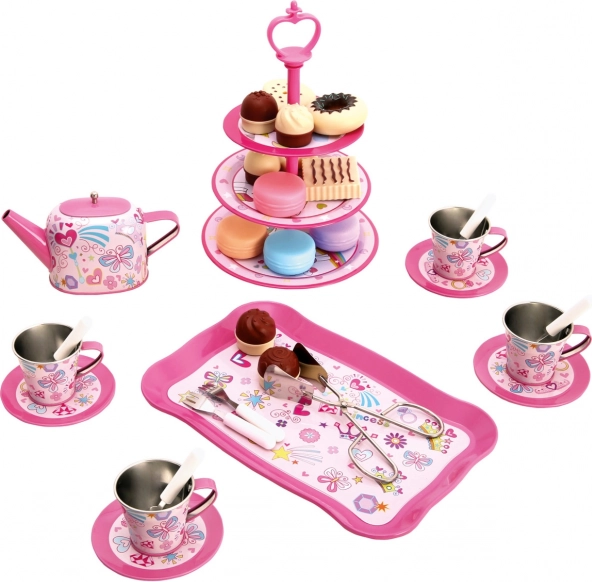 Kompletny serwis z dzbankiem, filiżankami, spodkami, tacą i piętrowym stojakiem na ciasteczka – wszystko do realistycznego przyjęcia herbacianego.