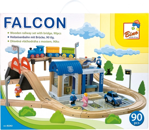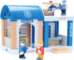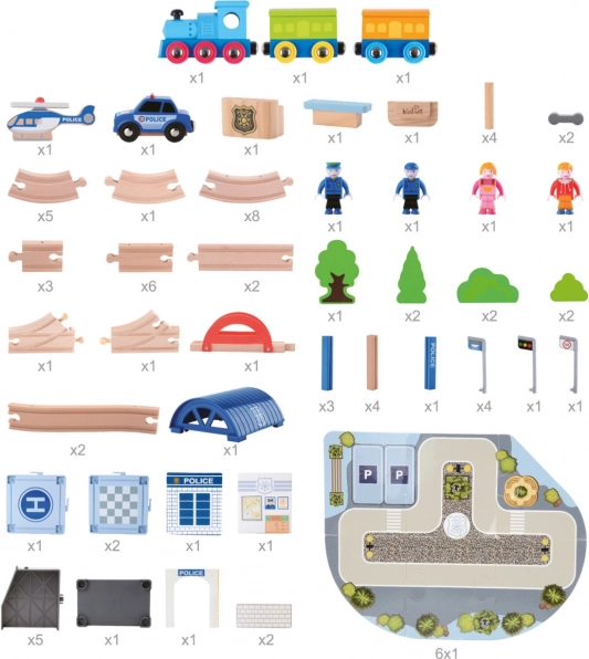 Ta szczegółowo dopracowana drewniana kolejka jest idealna dla małych inżynierów, którzy kochają pociągi i policyjne przygody. Zawiera tor z mostem, atrakcyjny posterunek policji oraz inne akcesoria, w tym autko i helikopter.