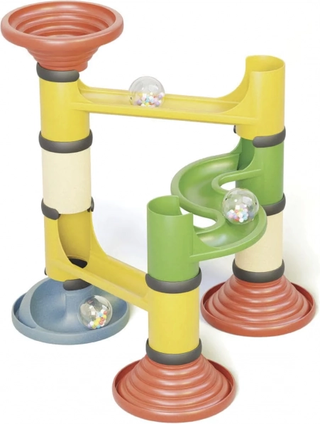 Dzięki tej wyjątkowej zabawce dzieci mogą szybko i intuicyjnie tworzyć różne tory kulkowe dzięki łatwemu łączeniu elementów. Wszystkie części wykonane są z innowacyjnego bioplastiku, który łączy włókna drzewne z plastikiem. Ten ekologiczny wybór znacząco redukuje emisję CO2 podczas produkcji, a materiały są w 100% poddające się recyklingowi. Zabawka nie tylko wygląda i pachnie jak drewno, ale jest również trwała i przyjemna w dotyku.