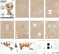 Odkryj urok świata z dekoracyjnym i funkcjonalnym modelem – drewnianym globusem z podświetleniem LED, który złożysz samodzielnie. Dzięki układowi przekładni globus obraca się płynnie, znajdziesz tu także mechaniczną lupę do czytania detali oraz energooszczędne oświetlenie LED zasilane przez microUSB/USB-A. Zestaw z wysokiej jakości sklejki oferuje wysoki poziom trudności, doskonale sprawdza cierpliwość i koncentrację, a po złożeniu zamienia się w stylową lampkę nocną w retro designie.
