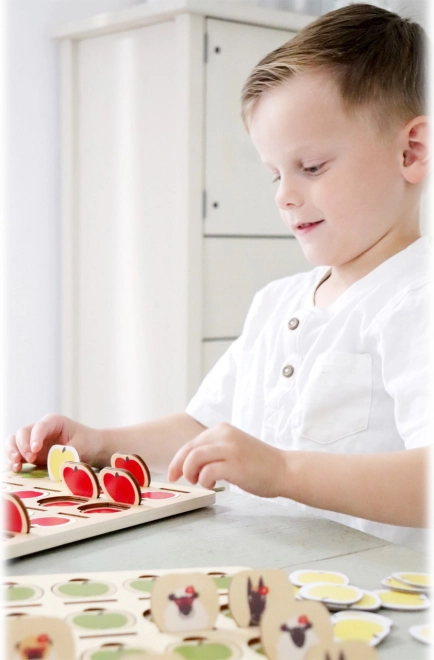 Kolorowe ilustracje zwierząt i jabłek na wytrzymałych planszach zachęcają do zabawy i znoszą intensywne użytkowanie przez dzieci. Idealne do wielokrotnych rozgrywek w domu i w podróży.