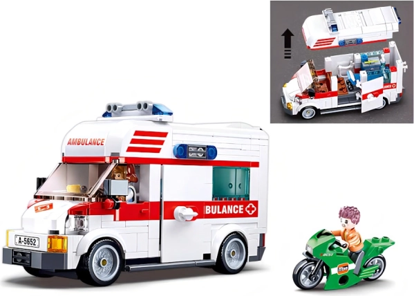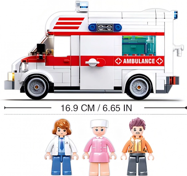 Zbuduj własny zespół ratunkowy z zestawem Sluban Town karetka. Zestaw oferuje 328 elementów, 3 figurki z ruchomymi częściami oraz niski poziom trudności dla dzieci od 6 lat. Karetka o długości 16,9 cm, nosze i akcesoria wspierają kreatywną zabawę i scenariusze pierwszej pomocy. Elementy wykonane są z wytrzymałego i bezpiecznego plastiku ABS i są kompatybilne z LEGO, COBI i Mega Bloks.