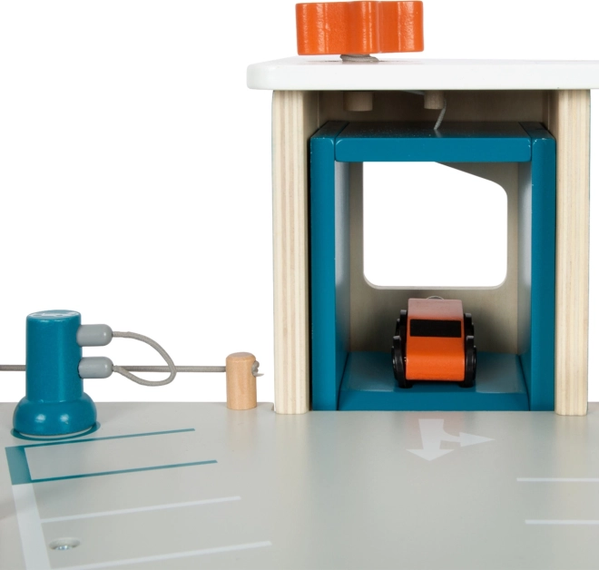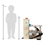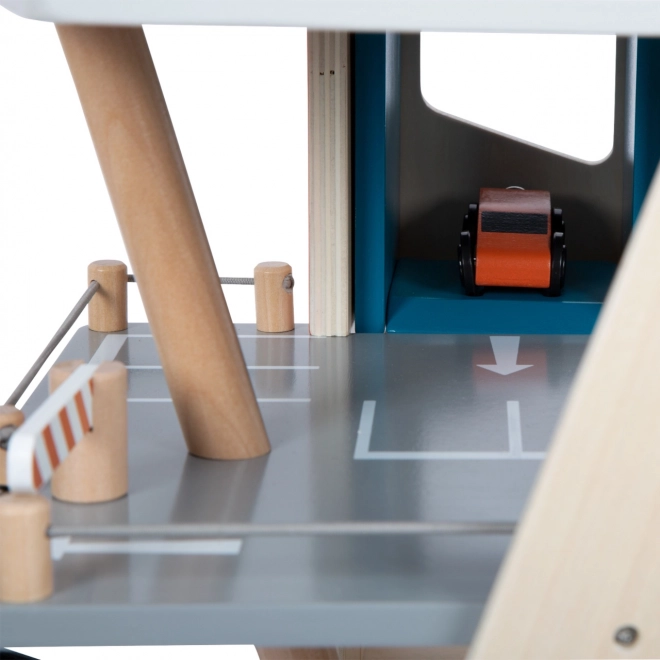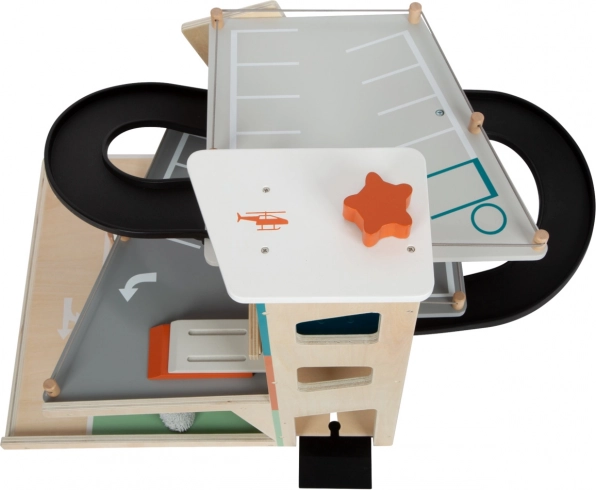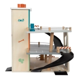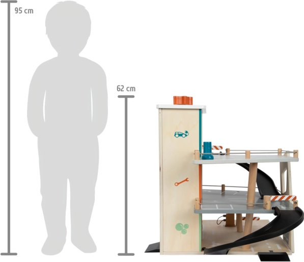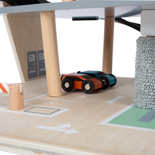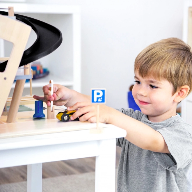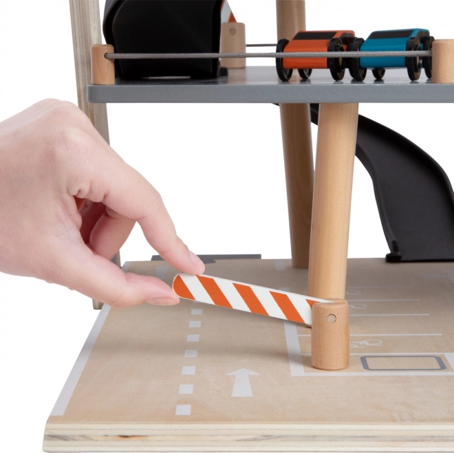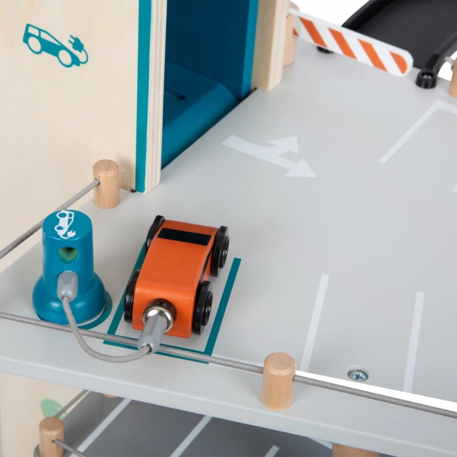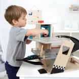 To designerskie drewniane wyścigowe parkingowisko oferuje dzieciom bogato wyposażony świat zabawy. Trzy piętra połączone są działającą windą i dwiema płynnymi rampami, które umożliwiają swobodny ruch samochodzików. Każdy poziom wyposażono w mechaniczny szlaban i gumowe barierki, co zwiększa dynamikę i zapobiega wypadaniu pojazdów. Kolorowe ikony i oznakowanie drogowe wspierają naukę przez zabawę i rozwijają wyobraźnię.