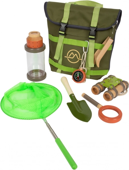 W zestawie znajduje się komplet narzędzi dla młodych odkrywców. Od lupy po kompas, wszystko, co potrzebne jest częścią plecaka.
