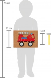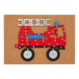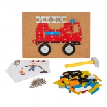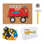 Obszerna kreatywna zestaw do zabawy o tematyce transportu, zawierająca korkową podkładkę, drewniany młotek oraz wiele drewnianych elementów o różnych kształtach i kolorach. Pomaga rozwijać kreatywność, zręczność oraz koordynację ręka-oko.