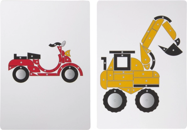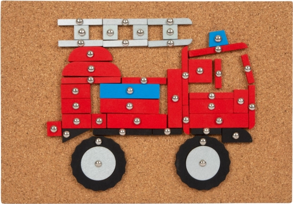 Z tą klasyczną grą do wbijania w nowoczesnych kolorach dzieci mogą tworzyć obrazki środków transportu i maszyn budowlanych według sześciu obrazkowych szablonów lub zgodnie z własną wyobraźnią. Główne cechy: