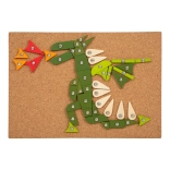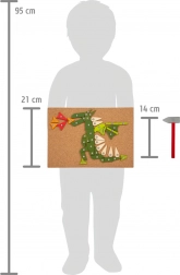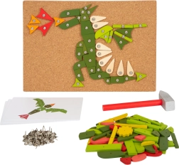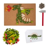 Zestaw zawiera korkową podkładkę, drewniany młotek, kolorowe elementy oraz pinezki do tworzenia obrazków.