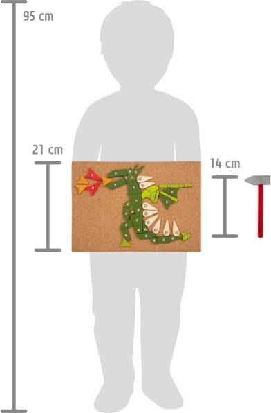 Ta zabawka do wbijania jest idealna dla małych odkrywców z wyobraźnią. Rozwija umiejętności motoryczne i wspiera kreatywność u dzieci. Zestaw zawiera elementy o różnych kształtach i kolorach, które można łatwo wbijać w korkową podkładkę.