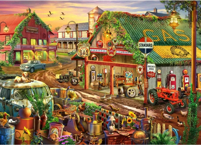 Stylowe puzzle Brain Tree z motywem wiejskiej stacji benzynowej oferują 1000 unikalnie wyciętych elementów, matową powierzchnię z pierwszorzędnym nadrukiem oraz bogate akcesoria dla komfortowego układania. Ciesz się różnorodnymi kształtami elementów, plakatem w jakości puzzli, praktycznymi przegrodami do sortowania, podstawką na wieko oraz trwałym, zamykanym woreczkiem chroniącym elementy.
