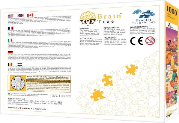 - Puzzle 1000 elementów, plakat 52 × 30 cm, kartonowe przegródki do sortowania, podstawka pod wieko pudełka, zamykany woreczek