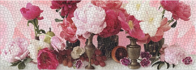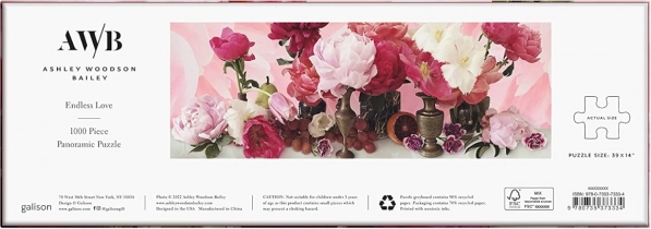 Panoramiczne puzzle Endless Love prezentują elegancką kwiatową martwą naturę pełną tulipanów i piwonii w delikatnych odcieniach różu i zieleni. Dzięki pierwszorzędnemu drukowi i matowej powierzchni detale oraz nasycenie barw są znakomicie oddane, dzięki czemu układanie jest równie piękne jak gotowy obraz. Autorką jest amerykańska artystka i fotografka Ashley Woodson Bailey, znana ze swoich wyrafinowanych botanicznych kompozycji.
