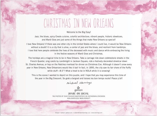 Puzzle 1000 elementów z motywem Świąt w Nowym Orleanie autorstwa Michaela Storringsa. Matowy druk, precyzyjny wykrój, materiały z recyklingu, solidne pudełko FSC®.