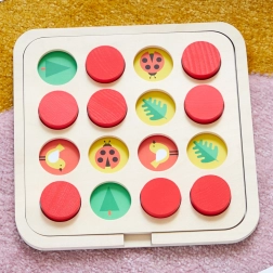 Plansza z 16 krążkami zakrywającymi jest zaprojektowana dla małych graczy od 3 lat. Wspiera rozwój umiejętności poznawczych, rozpoznawanie kształtów i kolorów oraz trening cierpliwości i koncentracji. Ilustracje są wyraziste, zabawne i łatwe do odczytania.