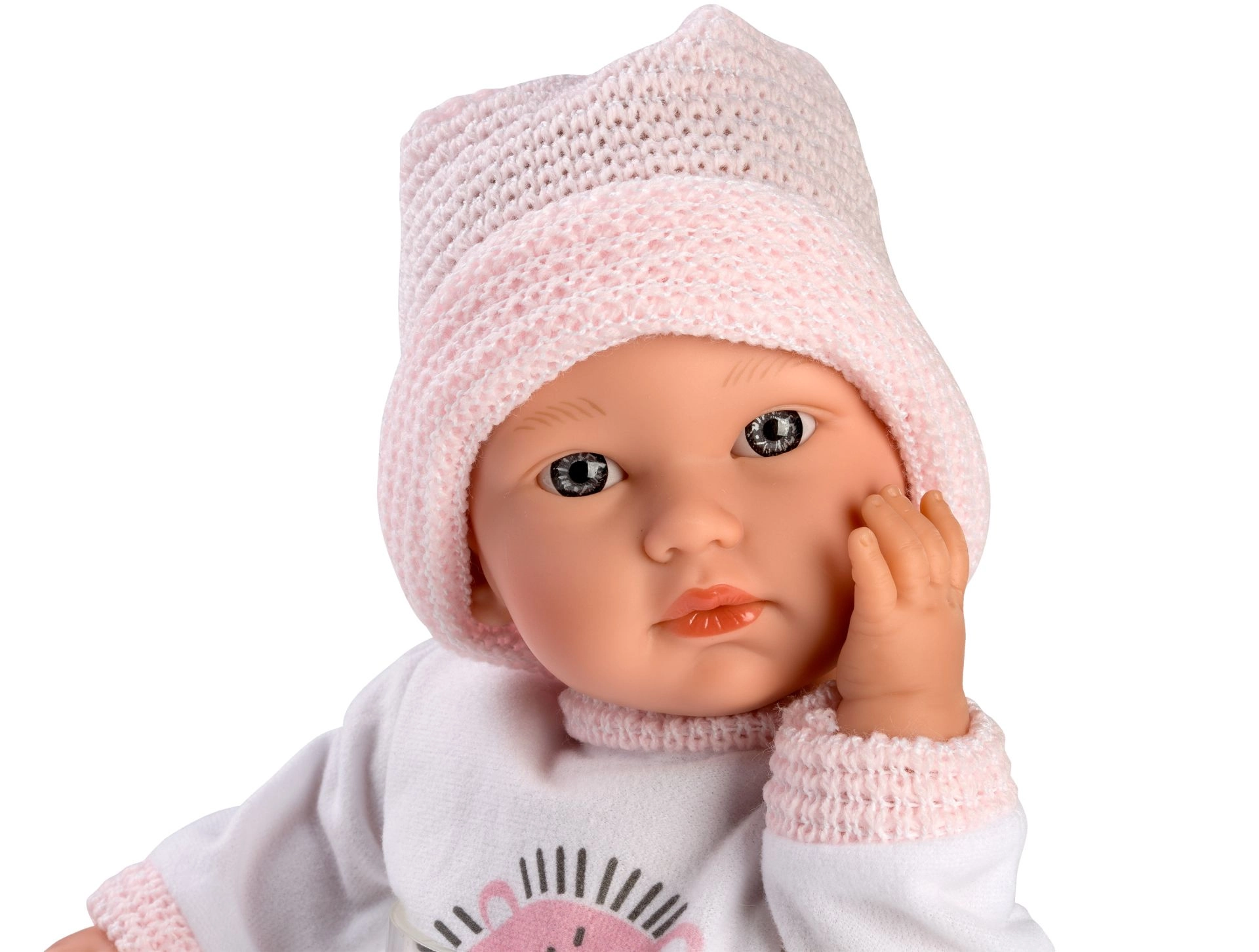 Po naciśnięciu brzuszka lalka zaczyna płakać i woła „mama, tata”, wspierając empatyczną zabawę i rozwój umiejętności społecznych. Ubranko z uroczym nadrukiem oraz dziana czapeczka łatwo się zakłada i zdejmuje, co rozwija małą motorykę.