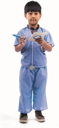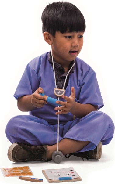 - Koszulka, spodnie, drewniany stetoskop, podkładka lekarska, termometr, zegar kieszonkowy, strzykawka, plastry