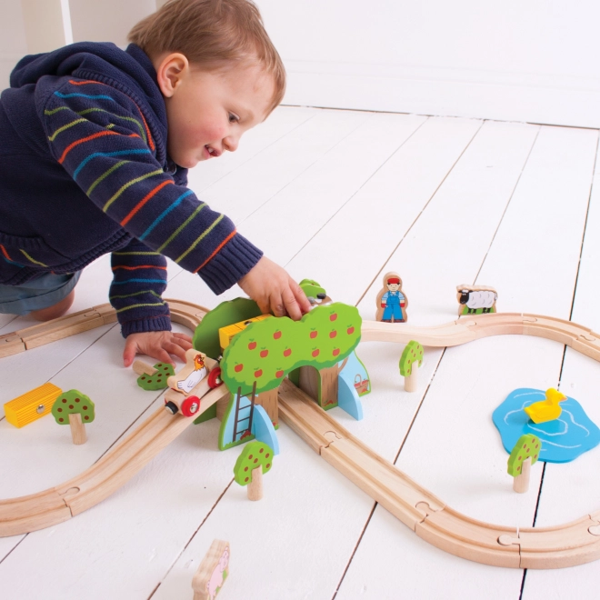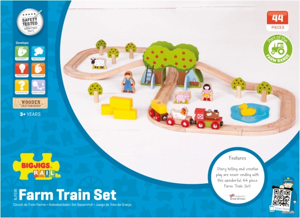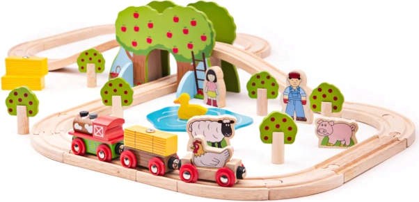 Ta piękna drewniana kolejka z motywem farmy od Bigjigs Rail zawiera 45 elementów, w tym postacie ludzi, zwierzęta i drzewa. Wspiera wyobraźnię i koordynację i jest wykonana z odpowiedzialnie pozyskiwanych naturalnych materiałów.