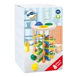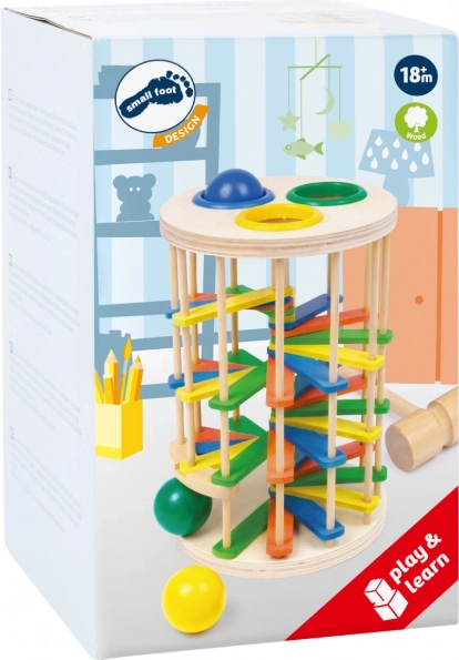 Wieża do wbijania z kulkami od Small Foot to idealna zabawka do rozwijania zdolności motorycznych dzieci. Składa się z wieży, gdzie dzieci wbijają 3 kolorowe kule przez plastikowe pierścienie i obserwują, jak kule spadają na dół rampą, wydając klikający dźwięk.
