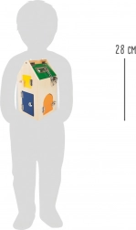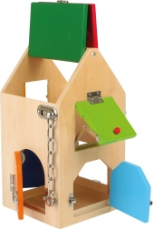 Domek wykonany jest z wysokiej jakości drewna w połączeniu z solidnymi metalowymi częściami, więc wytrzyma nawet intensywne użytkowanie. Dzięki kompaktowym wymiarom i praktycznemu uchwytowi jest łatwy do przenoszenia – idealny w podróży, do przedszkola i do pokoju dziecięcego. Kolorowe elementy zachęcają do odkrywania i wspierają rozpoznawanie barw.