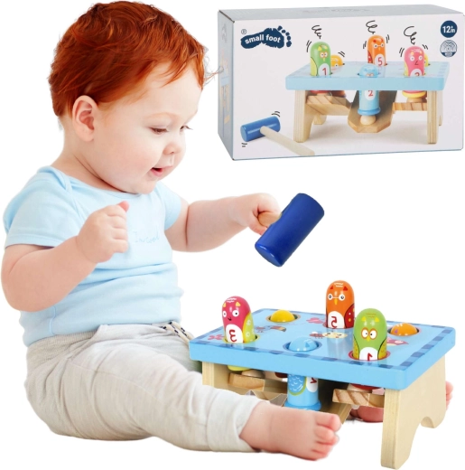 Zabawna drewniana ławeczka do wbijania marki Small Foot z motywem ptaków rozwija dziecięcą motorykę i koncentrację. W zestawie znajduje się stabilna ławeczka w jasnoniebieskim kolorze, kolorowe kołeczki oraz drewniany młotek. Zabawka wspiera koordynację ręka–oko, precyzję uderzeń oraz naukę kolorów i liczb, wykonana jest z wysokiej jakości drewna i odpowiednia dla dzieci od 18 miesięcy.