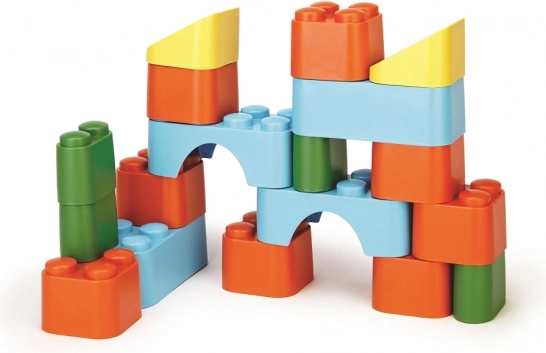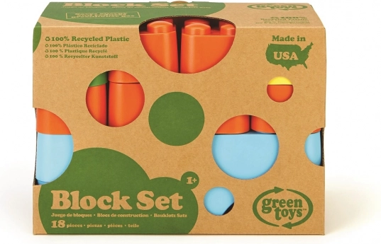 Ekologiczny zestaw klocków Green Toys – 18 bezpiecznych elementów z przetworzonego plastiku. Lekkie, wytrzymałe, bez PVC, BPA i ftalanów. Odpowiednie od 6 miesięcy.