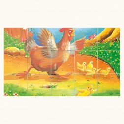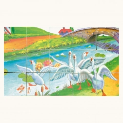 Dzieci ułożą obrazki gęsi przy potoku, szczeniąt na łące czy prosiąt przy chlewie – żywe kolory i miłe ilustracje wspierają wyobraźnię i poznawanie zwierząt.