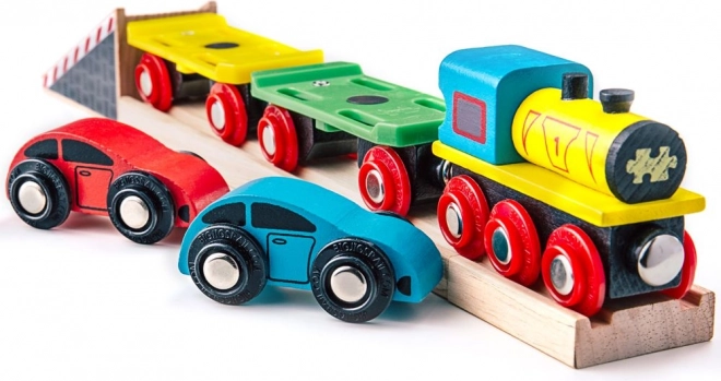 Lokomotywa z dwoma wagonami przewozi dwa autka w żywych kolorach – idealne do scenariuszy załadunku, transportu i rozładunku.