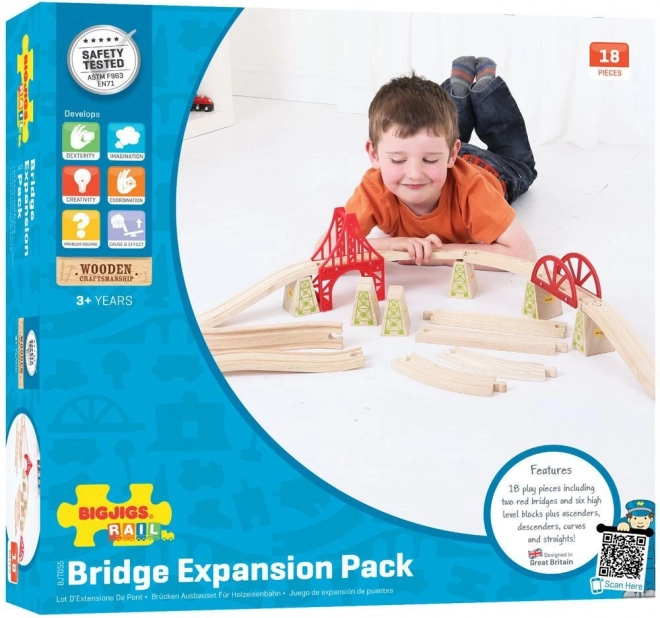 Rozszerz swoją drewnianą kolejkę o uniwersalny zestaw mostowy z 18 elementami, który doda zabawie nowe wysokości i przygody. Zestaw zawiera tory wznoszące i opadające, podpory oraz elementy mostów, aby łatwo pokonywać przeszkody. Jest w pełni kompatybilny z większością drewnianych kolejek i wykonany z wysokiej jakości drewna. Kompatybilność, wysokiej jakości materiały, bezpieczna zabawa oraz rozwój wyobraźni i małej motoryki.