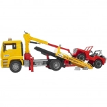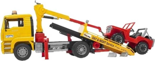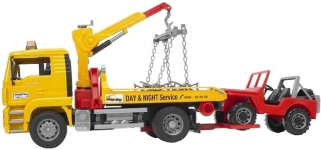 Bruder holownik MAN to idealna zabawka dla dzieci, które uwielbiają symulacje i zabawę realistycznymi modelami samochodów. Pojazd oferuje odchylaną kabinę, która pozwala zajrzeć do komory silnika i jest wyposażony w przednią szybę z trwałego poliwęglanu. Za kabiną znajduje się obrotowe ramię manipulacyjne z łańcuchami do łatwego manipulowania jeepem.