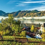Puzzle pokazują spokojny widok na jezioro Schliersee otoczone górami i jesiennymi lasami.