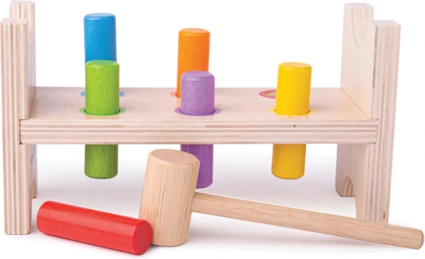 Wbijanie kolorowych kołeczków młoteczkiem wzmacnia chwyt, precyzję oraz koordynację ręka–oko – idealne na pierwsze wyzwania motoryczne.