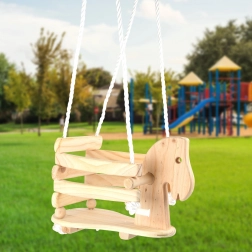 Hej, do przodu w rytmie huśtania! Ta dziecięca huśtawka w kształcie konika z litego drewna oferuje bezpieczne i wygodne siedzenie dzięki przestronnemu siedzisku, oparciu oraz podwyższanej barierce. Boczne uchwyty dla pewnego chwytu, wytrzymałe linki nylonowe z metalowymi kółkami oraz udźwig 30 kg gwarantują stabilną i radosną zabawę w domu i w ogrodzie.
