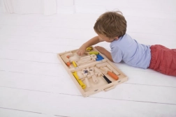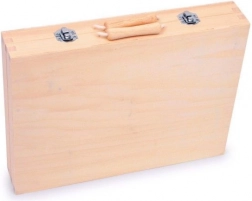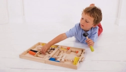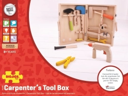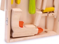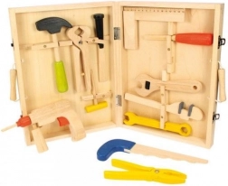 Świetna drewniana walizka z narzędziami dla wszystkich młodych majsterkowiczów, którzy chcą rozwijać swoje umiejętności rzemieślnicze. Zawiera młotek, szczypce, wiertarkę i klucze do nakrętek, wszystko z wysokiej jakości materiałów.
