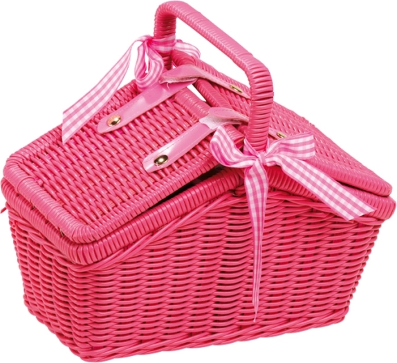 Ten różowy kosz piknikowy to idealny towarzysz wycieczek z lalkami i dziecięcych herbatkowych spotkań. Nowoczesny design w stylu lat 70. w połączeniu z metalowymi naczyniami z kwiatowym wzorem ucieszy małych gospodarzy i gospodynie. Kosz z tworzywa imitującego wiklinę jest wystarczająco pojemny na cały zestaw naczyń i małe smakołyki.