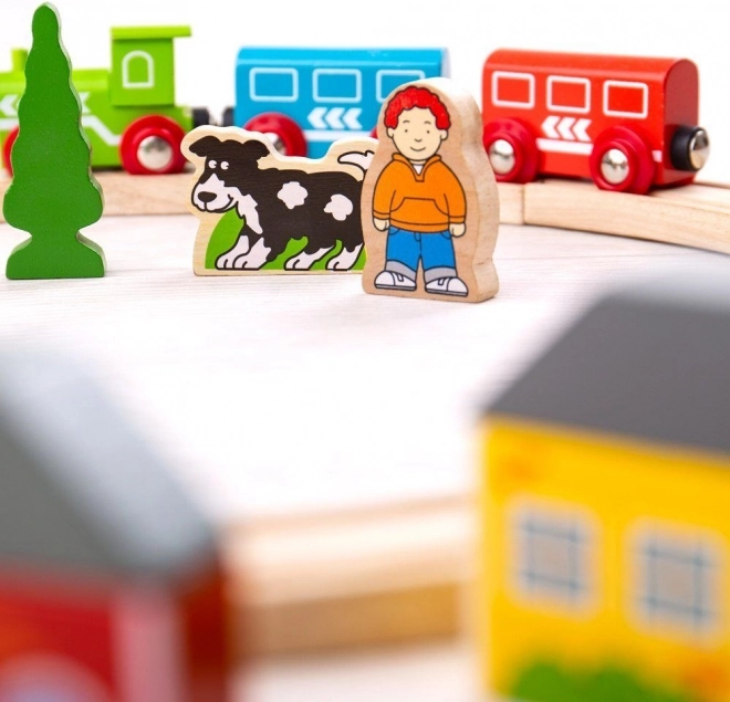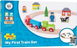 - 8× drewniane tory, 1× lokomotywa, 2× wagonik z magnetycznymi złączkami, 8× dodatki (domy, drzewa, figurki)