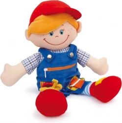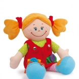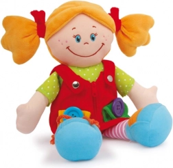Żywe kolory, przyjemny w dotyku materiał i interaktywne detale wspierają wrażenia dotykowe oraz koncentrację. Dzieci ćwiczą chwyt, manipulując różnymi elementami na ubranku.